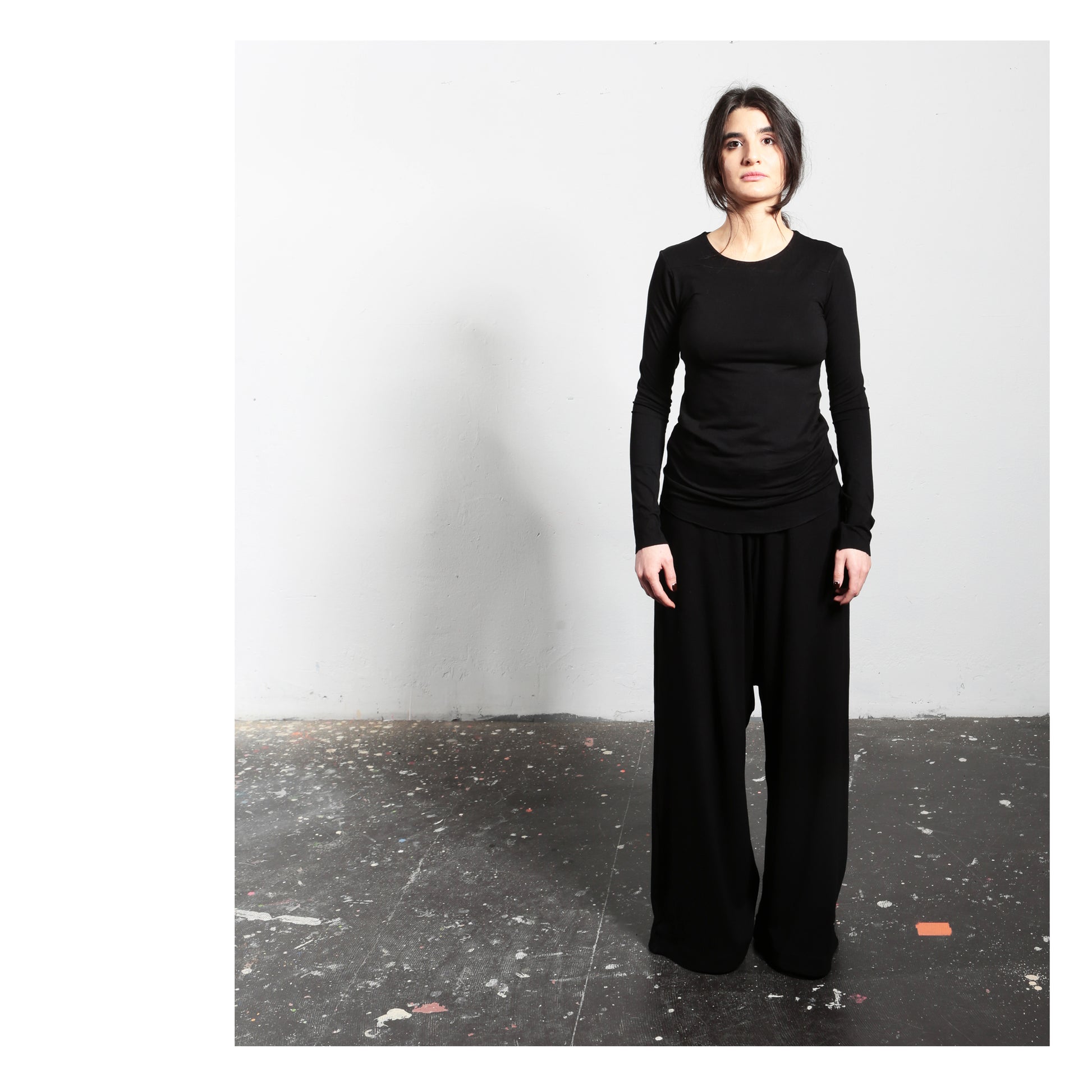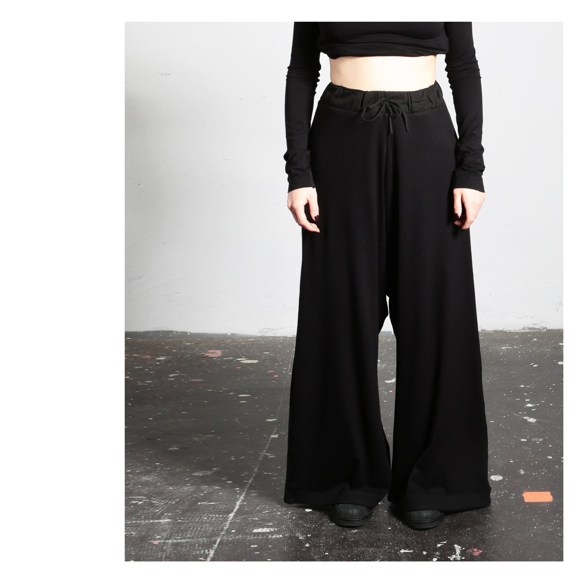 Bewusst sehr weit konstruierte Hose, aus super weichem, Garn- gefärbtem Viskose Jersey. Konfektionierter Bund mit eingearbeitetem Gummi, umgesetzt in einem Ton in Ton Materialmix. Alle Oberstoffe in bewusst minimalistischem, in glatter Oberflächen Optik gehaltenem, Waren Charakter. – wie aus einem Guss.